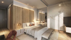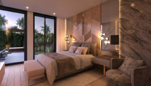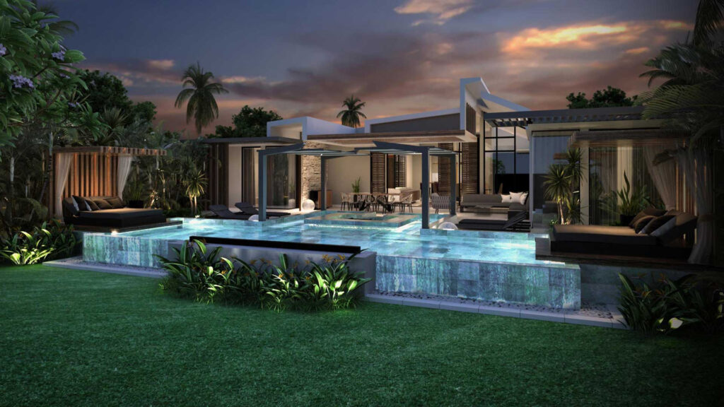 Les Villas Aquamarine de 3 chambres à coucher Ensuite évoquent le charme et la convivialité de l’île. Elles offrent un espace intérieur de 300 m2, jouissant de terrasses privatives, une vaste piscine à débordement et un extérieur entre modernité, confort et art de vivre.