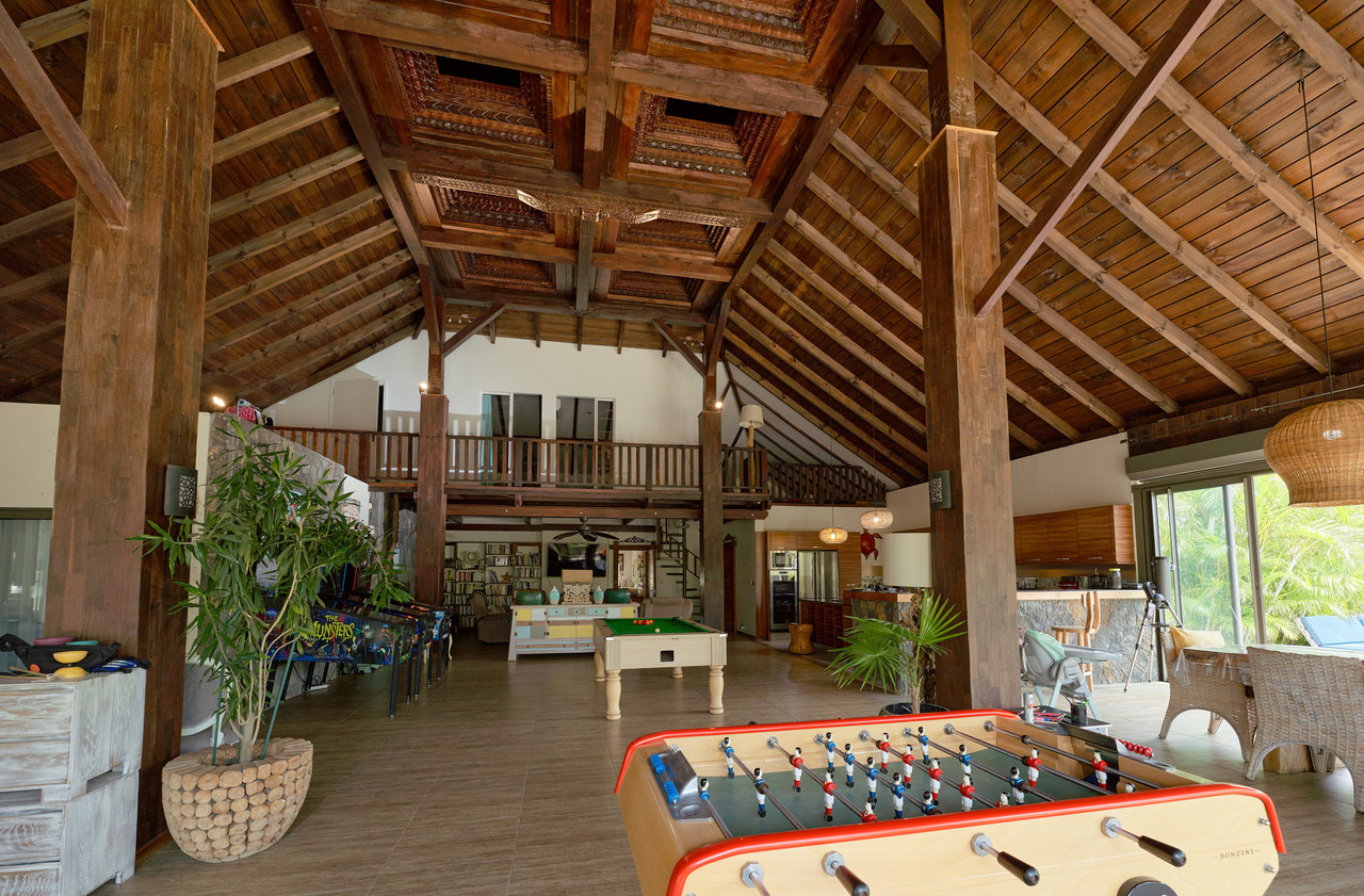 Profitez de la belle cuisine américaine équipée attenante au spacieux salon / salle à manger pour préparer un festin culinaire. Dans le salon, vous pourrez vous divertir avec les 3 flippers, le billard, et le babyfoot.