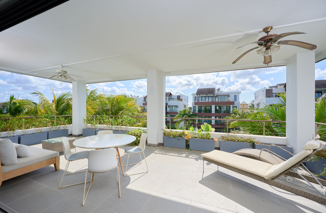 Profitez de la grande terrasse semi-couverte avec vue sur le lagon de la résidence pour vous détendre.