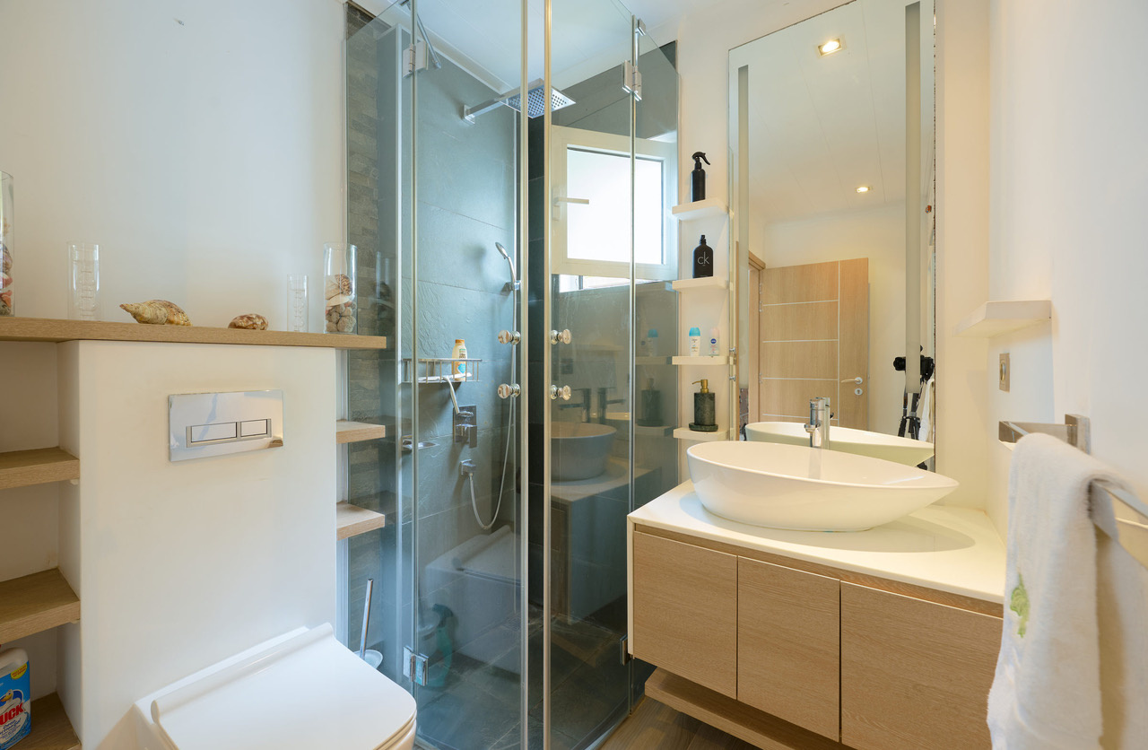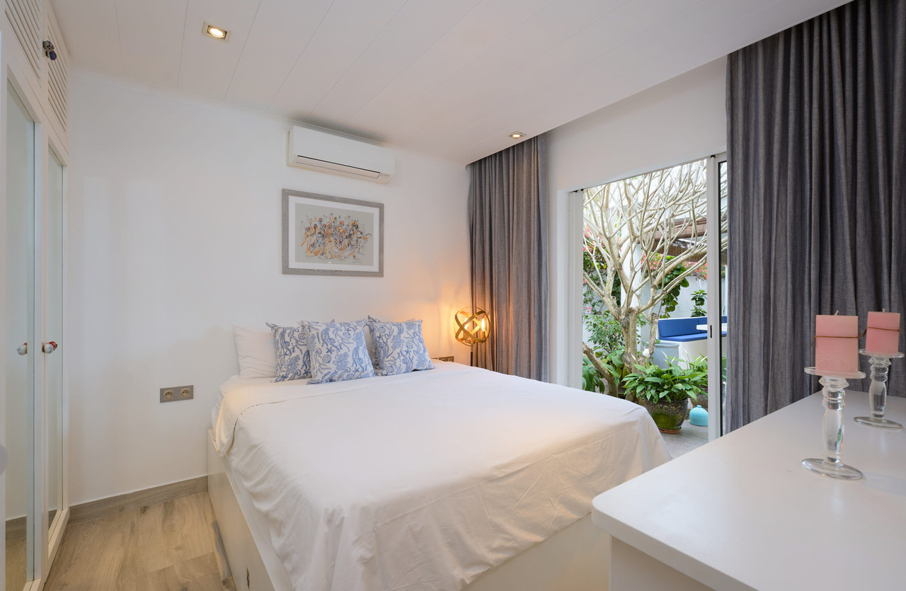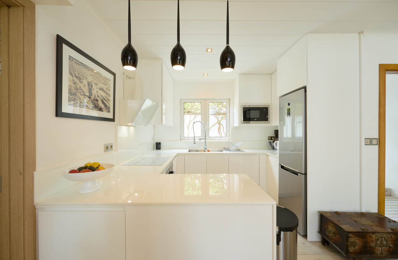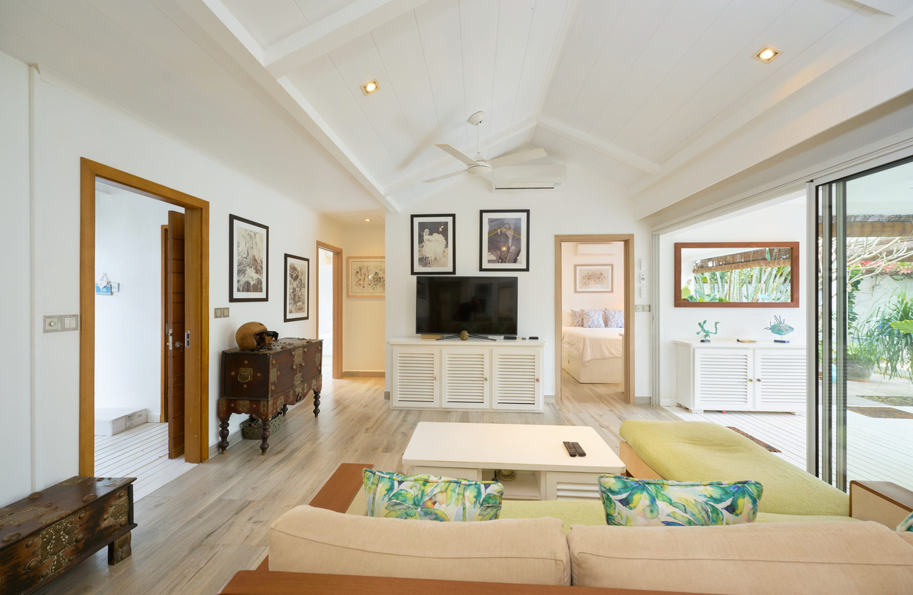 Elle est constituée de 2 chambres et un bureau comprenant 1 lit d’une personne avec rangement encastrés. Cette villa est dotée également d’une cuisine américaine équipée reliée à un spacieux salon / salle à manger et d’une buanderie. Une des chambres dispose d’une télévision en face du lit, d’un bureau et de rangements.